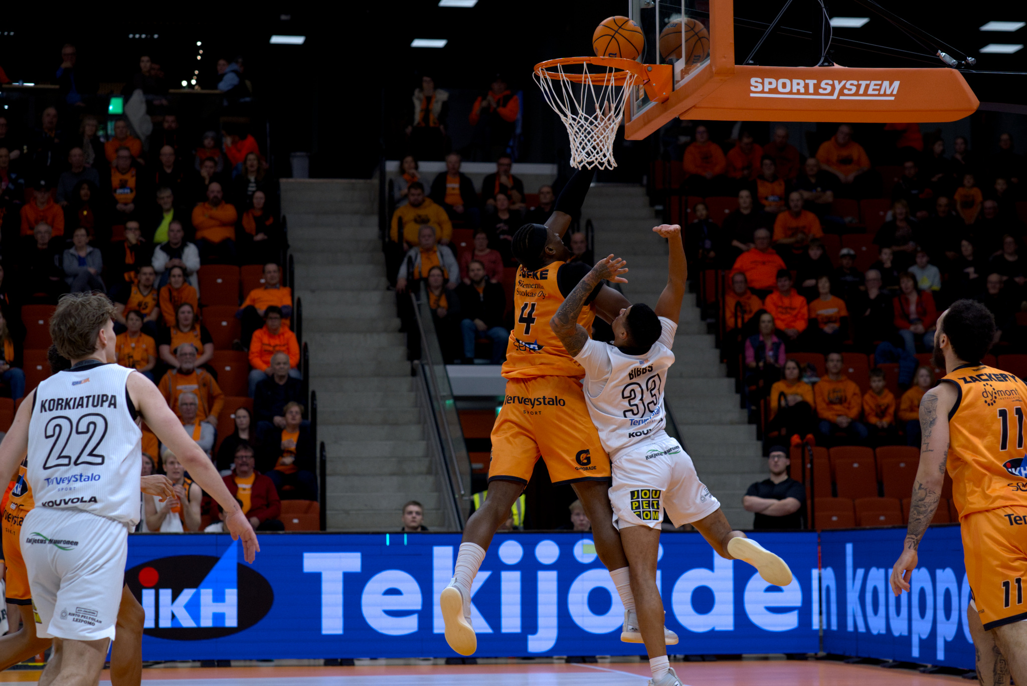 Ike Nweke tekemässä koria Tai Bibbsin estelyistä huolimatta joukkueiden kauden ensimmäisessä kohtaamisessa IKH Areenassa (kuva: Janne Yli-Korhonen)