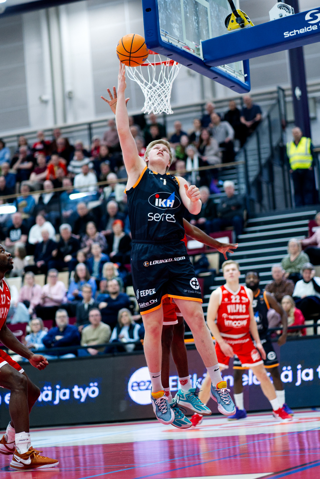 Oranssipaidat aloittivat hyvin. Eemi Luukkonen (9/7/2) teki viisi pistettä ja vieraat johtivat parin minuutin kohdalla 2-7. Sitten esillä oli sentteri Ike Nweke (18/15/2), joka nosti pari koria ja kokosi ottelussa komean tupla-tuplan 18 pisteellä sekä 15 levyrillä. Kun Antti Ahonen (5/1) upotti kolmosen ennen avauskympin puoliväliä, lukemat olivat 9-16 ja Vilpas käytti ensimmäisen aikalisän. Pienen huilin jälkeen, isännät tulivat 6-0 jaksolla pisteen päähän, mutta Juuso Salmen kolmonen (5/1/1) piti kauhajokiset edellä. Vilpas otti johtopaikan sentterien johdolla. Ze’Rik Onyeman (19/11) ja Luukas Vaara (7/5) muokkasivat tilanteeksi 25-24, mutta avausneljänneksen loppulukemiksi 25-26 tehtaili Fiifi Aidoo /7/1/3) kahdella vapaaheitolla.