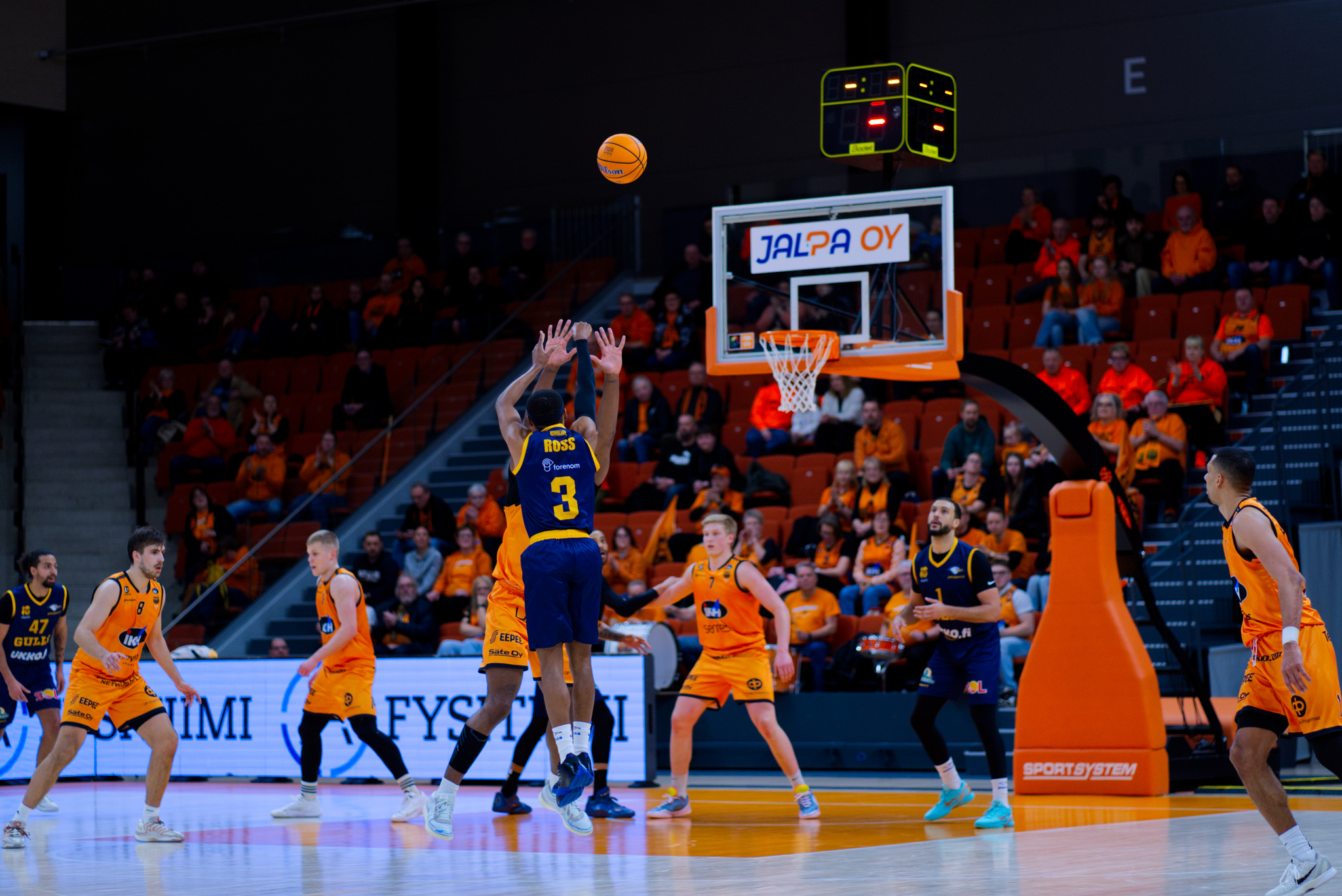 Skyler Flatten upottamssa voittoheittoa summerin soidessa (kuva: Janne Yli-Korhonen)