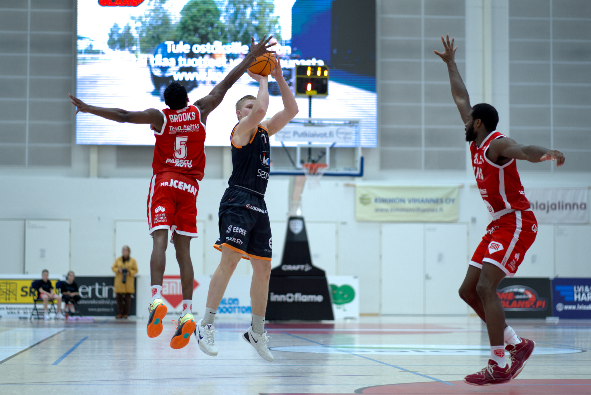 Eemi Luukkonen upottamassa kolmosta Salohallissa Jalen Brokksin estelyistä huolimatta (kuva: Janne Yli-Korhonen)
