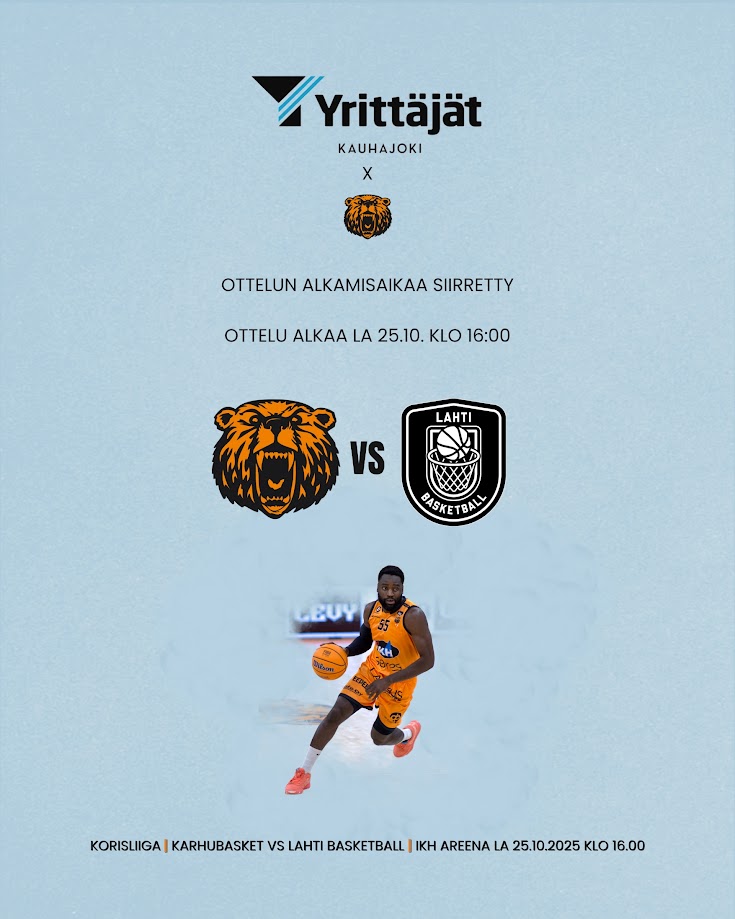 Lauantaina 25.10. pelattavan Karhubasket ‐ Lahti Basketball -ottelun alkamisaika on muuttunut. Ottelu alkaa klo 16.00 ja IKH Areenan ovet auki klo 14.00 alkaen.